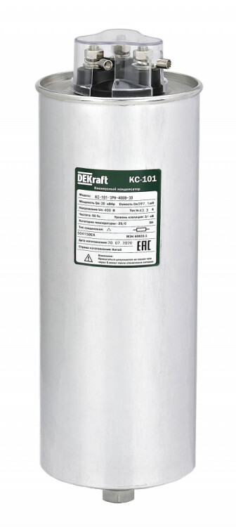 Косинусный трехфазный конденсатор самовосстанавливающегося типа серий КС-101 предназначен д ля корректировки коэффициента мощности в электрических сетях переменного тока 50/60 Гц напряжением 450 В. Номинальная мощность 30 кВАр.