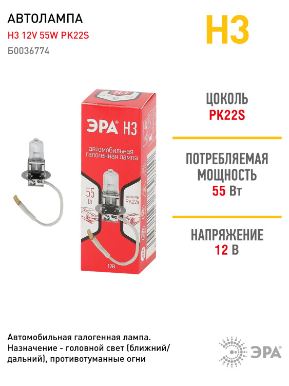 ЭРА Автолам па Н3 12V 55W PK22s (лампа головного света, противотуманные огни) (100/800/19200)