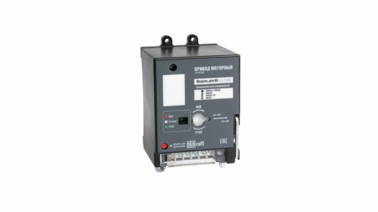 Привод моторный ПМ-333 Dekraft для автоматических выключателей серии ВА-333; предназначен для дистанционного включения/отключения выключателей; ном. напряжение - 230 В пер.тока; ном.мощность – 120 Вт; установка – с лицевой стороны выключателя; присоединяемые провода – 1,0…2,5 кв. мм. Приводы особенно важны для применения в электроустановках с затрудненным доступом, а также в тех случаях, когда ежедневно требуется выполнять большое количество операций включения/отключения.