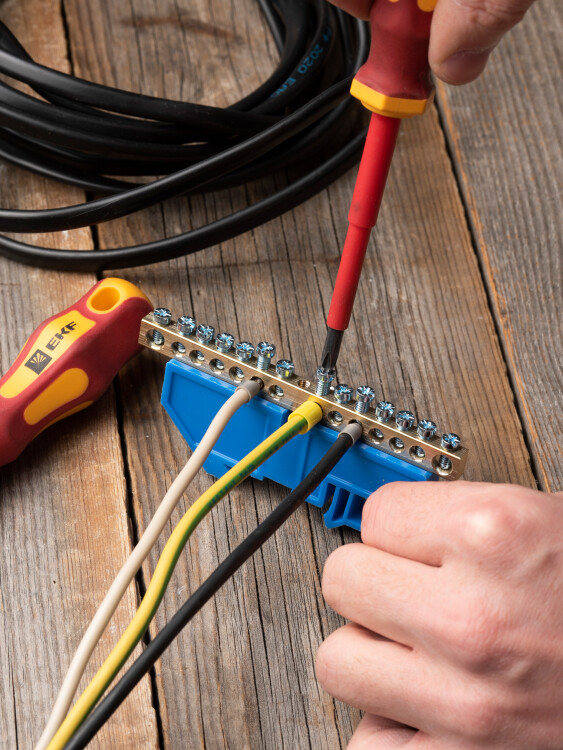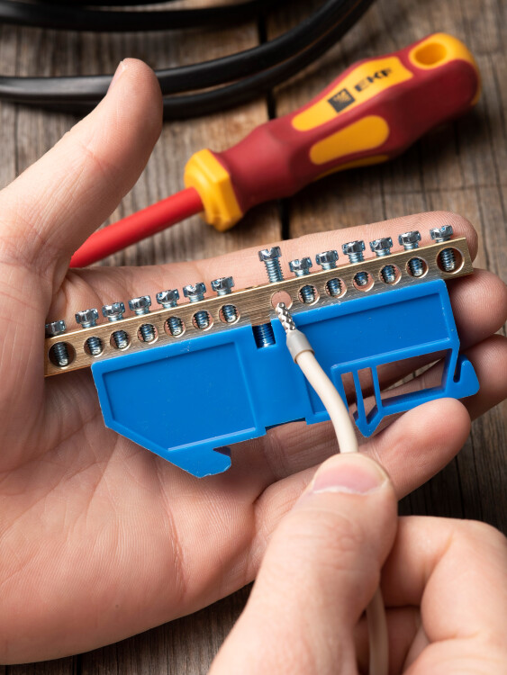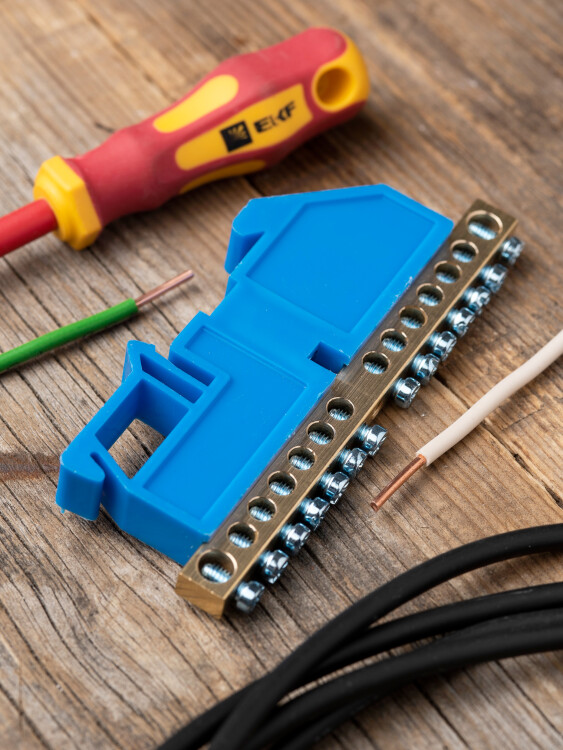 EKF PROxima Шина "0" N (6х9мм) 14 отверстий латунь синий изолятор на DIN-рейку.