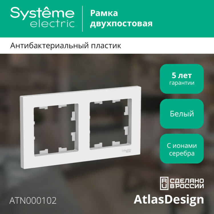 Рамка Systeme Electric (ранее Schneider Electric) серии AtlasDesign в цвете белый двухместная. Пластик с ионами серебра в белом цвете обеспечивает антибактериальный эффект. Устанавливается в вертикальном и горизонтальном положениях. Лицевые детали из качественного ABS-пластика, устойчивого к царапинам и УФ-излучению. Позволяет гармонично вписать электроустановочное изделие в интерьер помещения.