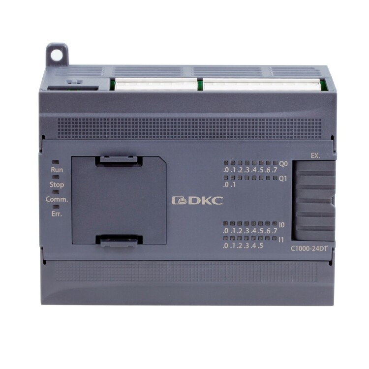 Программируемый логический контроллер ДКС серии «Митра Логик» (Mitra logic) C1000 предназначен для локальных систем автоматизации небольших и средних объектов (управление технологическими процессами, оборудованием, насосами, вентиляцией и т. п.). Модель C1000-24AT: питание 100-240В AC, 24 дискретных входа 24В DC (PNP/NPN), 16 дискретных выходов транзистор, порты: 2 RS485, 1 Ethernet, под держка расширения до 1 модуля BD и 14 модулей локальной шины. Габариты (ВхШхГ) 128×114×73 мм. Рабочая температура -20… +60 ºC.