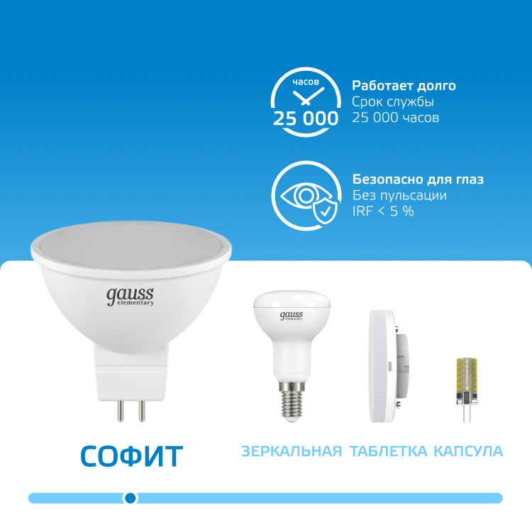 Лаконичная форма, высокий индекс цветопередачи, позволяющий создавать любые дизайнерские эффекты, а также отличные технические характеристики делают лампы Gauss серии MR16 идеальным вариантом для создания как внутреннего, так и уличного освещения. При мощности 5 и 7 Вт данные лампы имеют высокий световой поток 500-630 Лм. Они являются лучшей альтернативой галогенным лампам, аналогам ламп накаливания 35-50 Вт. Данная линейка имеет три цветовые температуры: 3000K, 4100K и 6500K. Светодиодные лампы MR16 отлично смотрятся в интерьерном освещении. Они имеют небольшие размеры, поэтому успешно используются для встраивания в мебель. Лампы с ярким направленным светом идеально подходят для освещения витрин. Именно серию MR16 часто используют для создания качественной подсветки в ювелирных магазинах. Кроме этого, их можно применять в наружном освещении в ландшафтных и тротуарных светильниках.