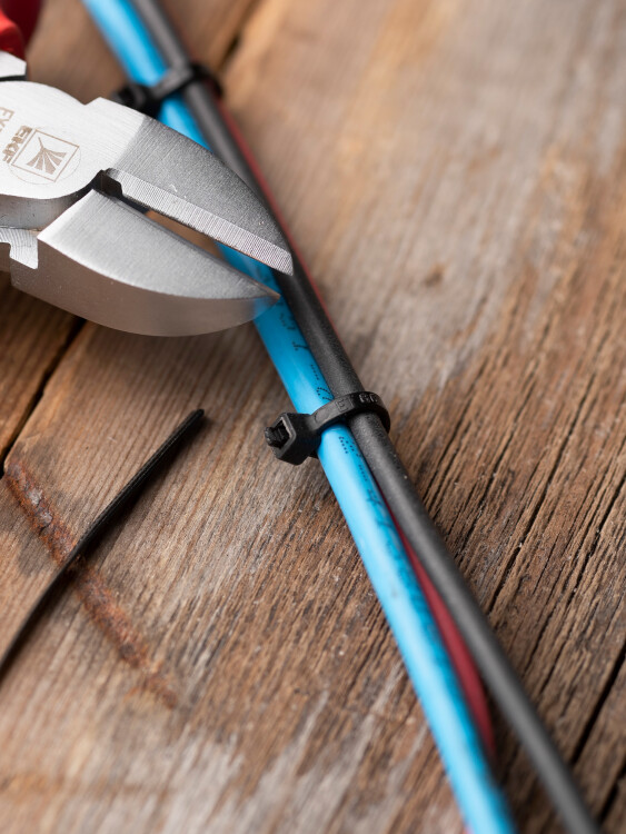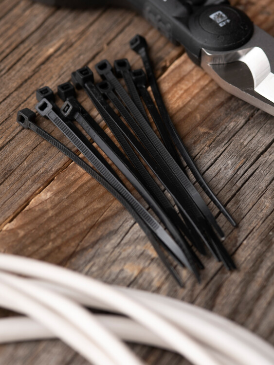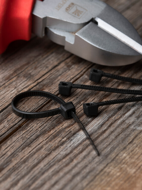 Предназначен для увязки кабелей и проводов в пучок и монтажа кабельных линий и проводников. Ремешок самофиксирующийся, блокирующий механизм. Изготовлен из Nylon 6.6, устойчивого к старению, коррозии, воздействию солей, ультрафиолета, кислот, щелочей, спирта, бензина и масел. При производстве кабельных стяжек черного цвета добавляется угольный порошок, который является одним из наиболее эффективных стабилизаторов. Он улучшает физические свойства продукции в стойкости к погодным условиям и УФ-излучению (прямые солнечные лучи).
