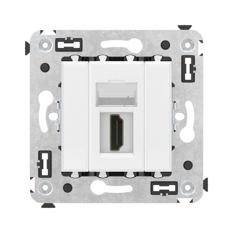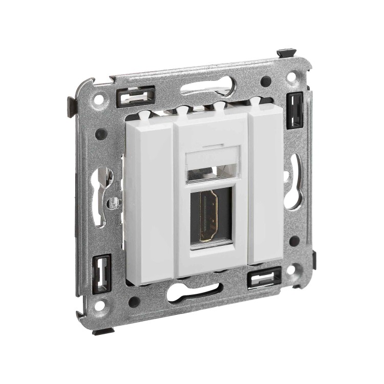 HDMI-розетка. Назначение: для монтажа в подрозеточные коробки глубиной не менее 45 мм (код 59301). Используется в качестве мультимедийной розетки для передачи сигнала (подключение проекторов, мониторов, телевизоров и др.). Характеристики: 1 модуль, с пылезащитной шторкой; с маркировочной табличкой;
