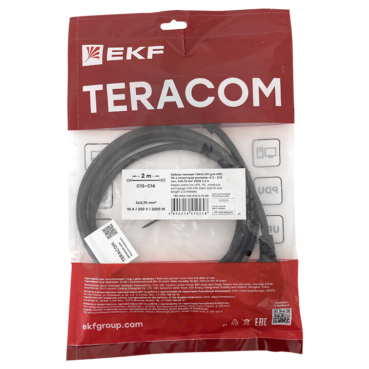Кабели электропитания TERACOM применяются для подключения PDU без встроенного в корпус кабеля питания к электросети или блоков розеток PDU к ИБП, а также для подключения к электросети конечных устройств таких, как активное серверное и сетевое оборудование, ИБП, мониторов и ТВ-экранов, системных блоков и компактных ПК. В ассортименте TERACOM имеются кабели питания длиной 2, 3 и 5 метров. Кабели питания имеют конфигурацию вилок С19-С20, С13-С14 или C13 - CEE 7/7 (Schuko), изготавливаются из высококачественной электролитической меди, обладают повышенной гибкостью и прочностью от многократных перегибов и изломов. Все кабели питания TERACOM поставляются в яркой розничной упаковке, проходят регулярную проверку качества на производстве и соответствуют всем российским и международным стандартам.