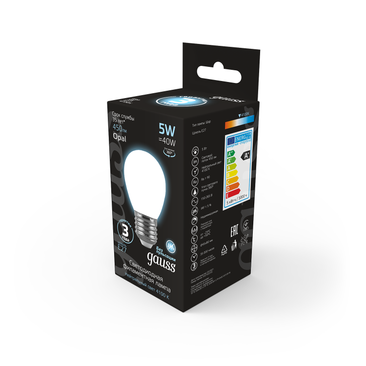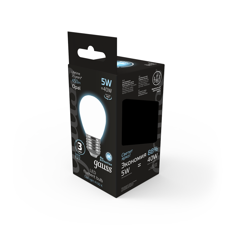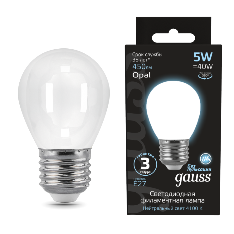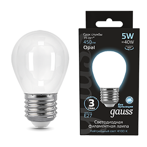Gauss Лампа Filament Шар 5W 450lm 4100К Е27 milky LED