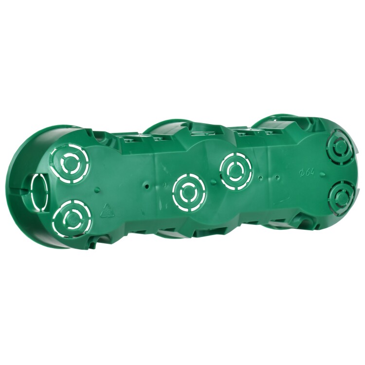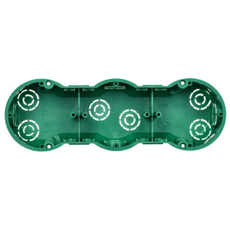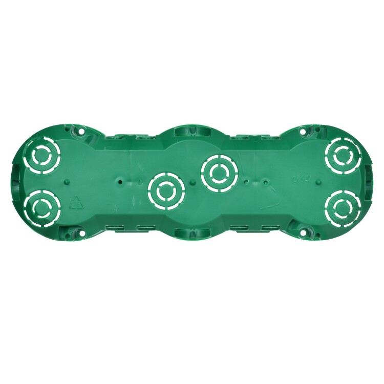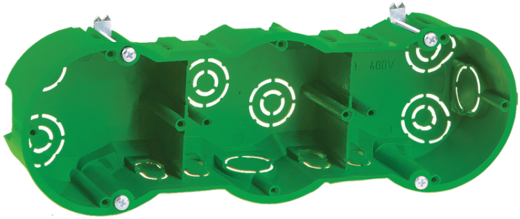 Установочные и распределительные коробки данной серии предназначены для монтажа в сплошные кирпичные или бетонные стены различных электроустановочных изделий: розеток, выключателей, диммеров. Используя крышку, изделия можно применять в качестве распаячной (разветвительной) коробки для развода кабеля и проводов. Материал изготовления: полистирол. Материал коробок является безгалогенным («HF» — halogen-free). Степень защиты: IP20. Температура эксплуатации: -15...+60. Цвет: черный. Количество вводов: 18 - D=20мм. Количество мест: 3. Размер: 212х70х45мм.