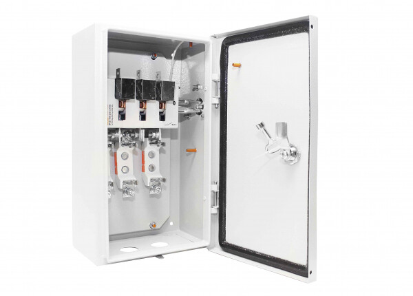 Возможность крепления на опору линии электропередач.Назначение:Используются для нечастых коммутаций и защиты от токов короткого замыкания в цепях трёхфазного переменного тока напряжением 380/220 В частотой 50 Гц. Упаковка:Коробка из картона Конструкция:Рубильник типа ВР32-31250.