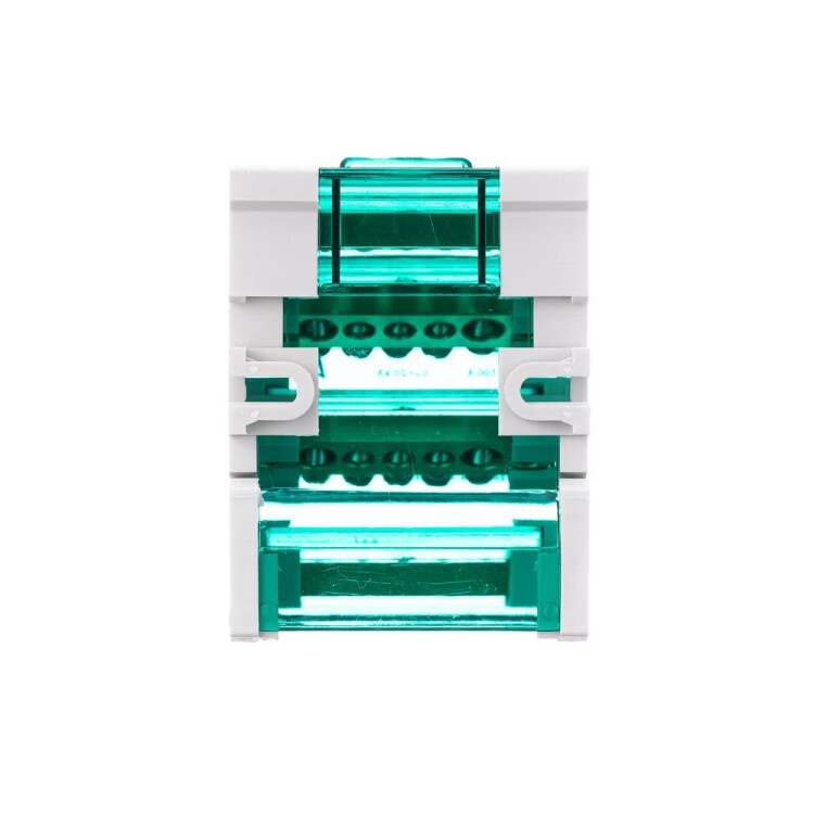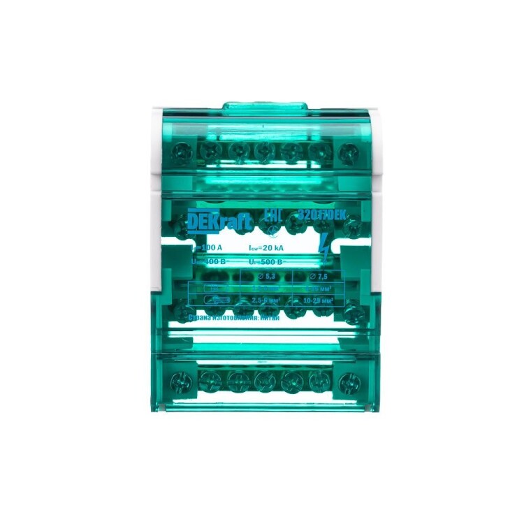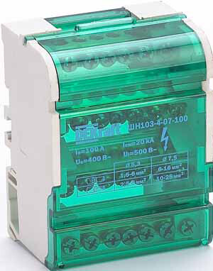 Кросс-модуль серии ШН-103 Dekraft; номинальный ток - 100 А; исполнение – 4 ряда по 7 отверстий (5х5,3 + 2x7,5); материал корпуса – нагревостойкий пластик; материал шин – высококачественная электротехническая бронза; каждая шина отдельно изолирована; цвет крышки – зеленый; установка – на DIN-рейку 35 мм или на монтажную панель двумя винтами M4; степень защиты - IP20. Применение кросс-модулей в щите обеспечивает компактную разводку кабелей и защиту от прикосновения к токоведущим частям.