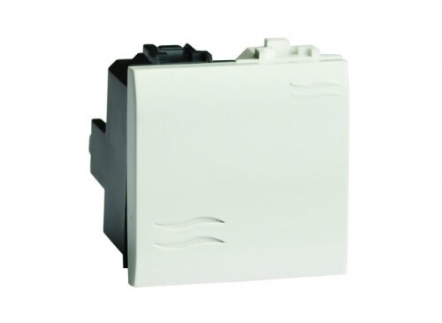 Переключатель (проходной выключатель). Назначение: включение/выключение освещения. Переключатели устанавливаются по 2 шт. на одну цепь для управления освещением из 2-х точек в коридорах, проходах, гостиничных номерах (у входной двери, изголовья кровати), проходных комнатах и т. д. Характеристики: номинальный ток − 16 А; номинальное напряжение − 250 B. Кол-во модулей: 2. Цвет: белый