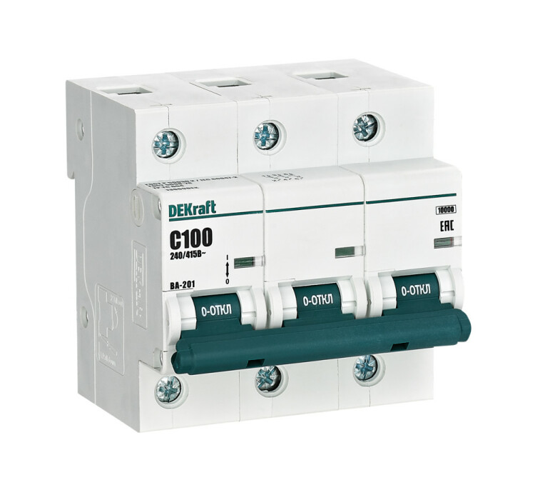 Автоматический выключатель серии ВА-201 DEKraft; 3P; номинальный ток 100 А; характеристика С; отключающая способность 10 кА; ширина модуля 27мм. Монолитная лицевая панель обеспечивает безопасную эксплуатацию аппарата. Окошко-индикатор всегда показывает состояние аппарата вне зависимости от положения рукоятки управления. Двухпозиционная защелка облегчает монтаж выключателя. Аппарат на 100% совместим с корпусами и оболочками DEKraft, Systeme Electric.
