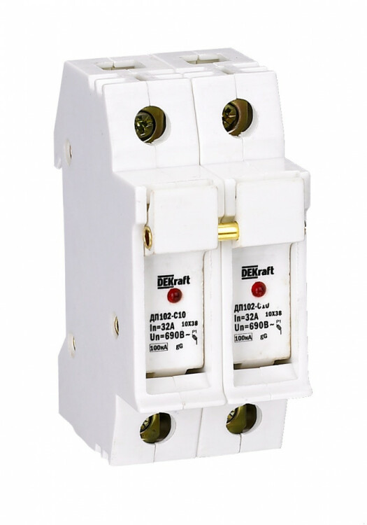 Держатель серии ДП-102 цилиндрического предохранителя ПЦ-102 Dekraft; 2P; для габарита С10 (10 x 38 мм); со светодиодной индикацией срабатывания; номинальный ток – до 32 А; ширина – 2 мод. х 18 мм; установка – на DIN- рейку; рабочее положение - любое, но предпочтительнее вертикальное; подключение питания - сверху или снизу; степень защиты – IP20. Предохранители применяются для защиты сетей от перег рузки и токов КЗ в сетях напряжением до 500 В.
