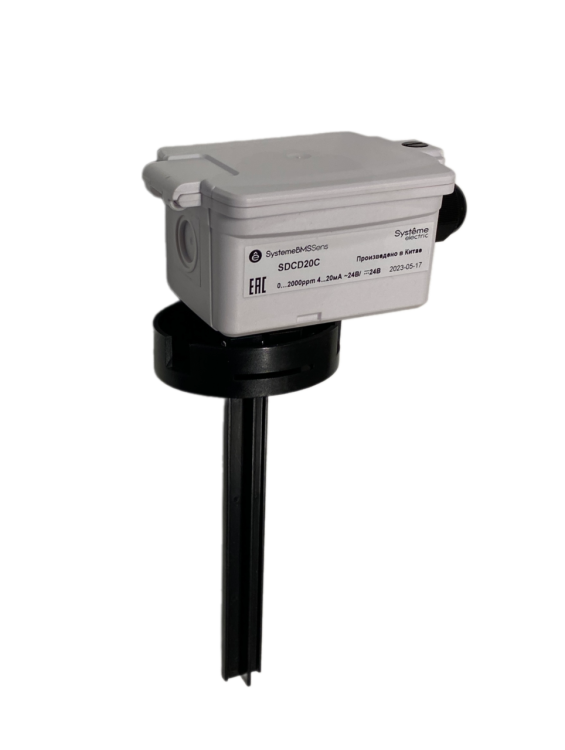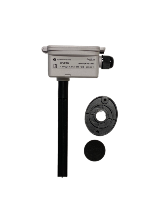 Датчик уровня концентрации углекислого газа CO₂ для установки в воздуховод, диапазон измерения от 0 до 2000 ppm, аналоговый выходной сигнал с трехпроводной схемой подключения и выбираемым сигналом 4…20мА или 0…10В, дискретный выходной сигнал нормально разомкнутый с выбираемым порогом 800/1000/1200 ppm, глубина погружения 145мм, установочный фланец входит в комплект поставки, напряжения питания от 15 до 24 В переменного или постоянного тока