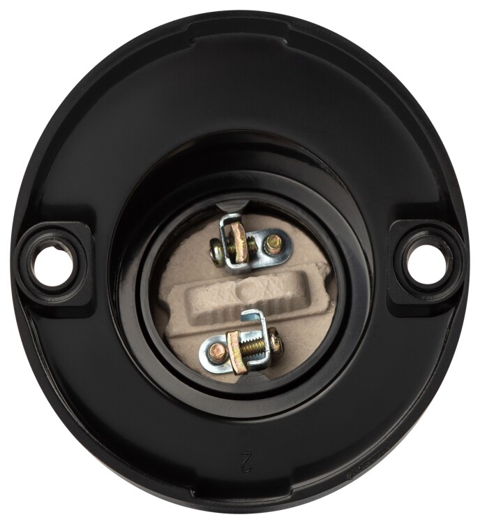 бакелитовый патрон настенный; способен выдерживать высокие температуры (до 300 градусов), обладает высокими электроизоляционными и антикоррозийными свойствами, не подвержен воздействию агрессивных сред; удобное подключение провода к контактной группе с помощью зажимных винтов