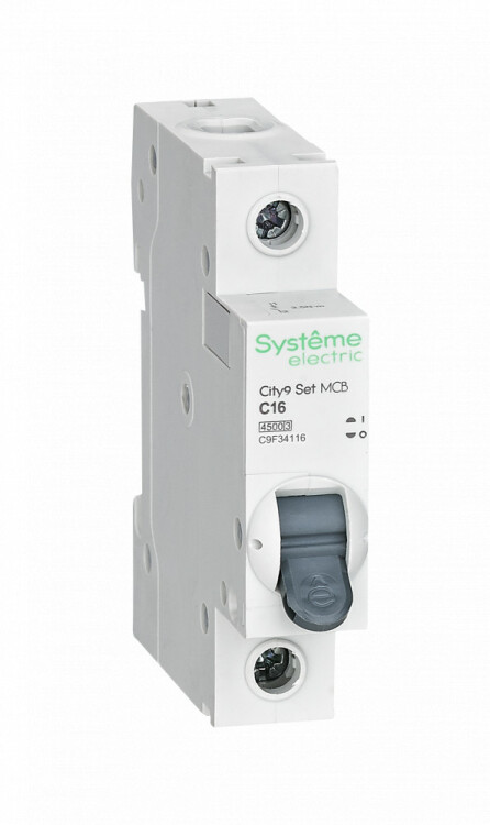 Автоматический выключатель серии City9 Set Systeme Electric, 1-полюсный, номинальный ток 16 А, характеристика С, Icn = 4.5 кА. Применяется в электрических сетях напряжением 230 В. Предназначен для защиты от перегрузок и токов короткого замыкания. Оснащен механизмом «мгновенной коммутации». Ударопрочный корпус из специального пластика с 6 металлическими заклепками. Безопасные клеммы исключают попадание кабелей в заклеммное пространство (ранее Schneider Electric EZ9F34116).