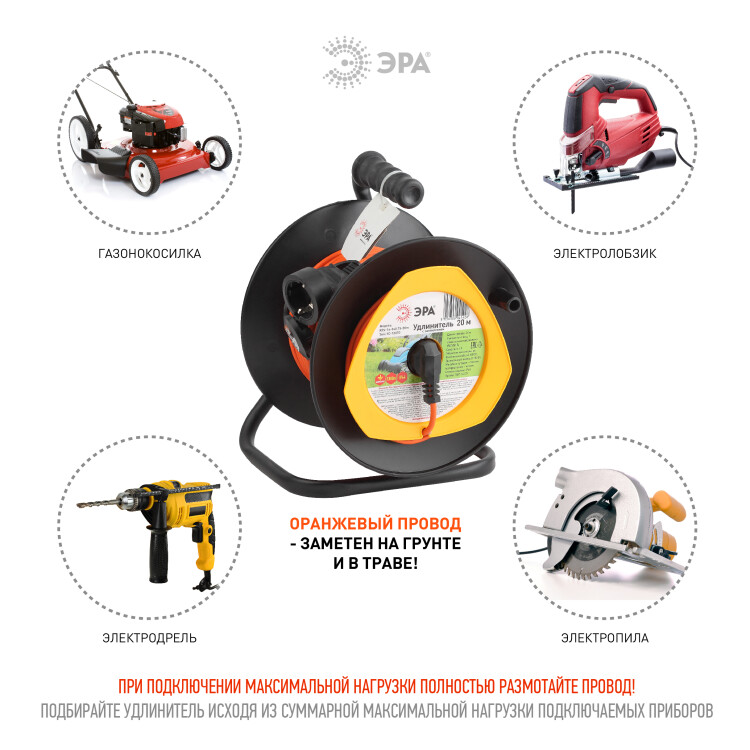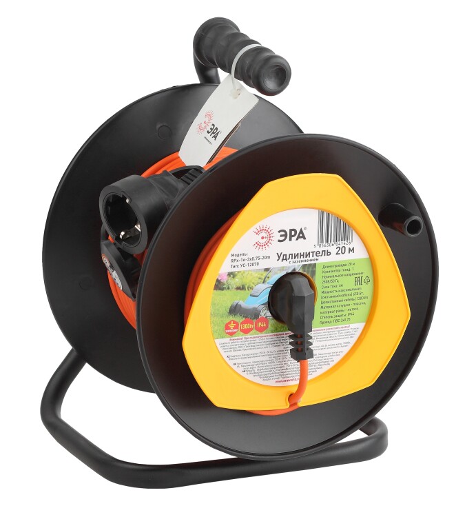Удлинитель силовой на пластиковой катушке ЭРА RPx-1e-3х0.75-20m с заземлением, ПВС 3х0,75м2, 1 розетка, 20 м. Мощность 6А/1300Вт. Используется для работы на строительных площадках или дачных участках. Удобен при работе с приборами находящимися удаленно от стационарной розетки. Например, газонокосилки, электрические, пилы, триммеры или электродрели. Провод в удлинителях Эра сделан из 100% меди, что делает его абсолютно пожаробезопасным. Рама удлинителя сделана из высокопрочной стали а пластиковой корпус выполнен с применением негорючих добавок.