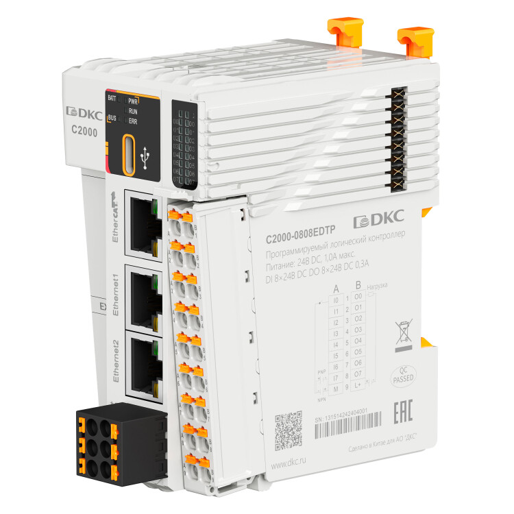 Программируемый логический контроллер ДКС серии «Митра Логик» (Mitra logic) C2000 предназначен для промышленной автоматизации средних и сложных систем (управление процессами, движением, интеграция в сети EtherCAT и др.). Модель C2000-0808EDTP: питание 24В DC, 8 дискретных входов 24В DC, 8 дискретных выходов 24В DC (PNP), порты: 1 RS485, 2 Ethernet, 1 EtherCAT, 1 Type-C, поддержка 2 модулей BD. Габариты (ВхШхГ) 53,7×100×80 мм. Рабочая температура -20… +55 ºC.