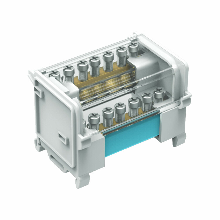 Предназначен для структурированного подключения отводных линий, разведения входящего проводника на несколько потребителей или участков. Позволяет создать упорядоченные системы распределения в электрощитах. Корпус блока выполнен из не поддерживающего горение полиамида PA6.6 и 2-х токоведущих шин в блоках 100 А, представляющие собой бруски из латуни с 7-ю отверстиями, в которые вставляются провода и зажимаются винтом. Избежать случайного прикосновения к токоведущим частям позволяет защитный экран на корпусе блока. Наличие задней крышки для предотвращения контакта с DIN-рейкой или металлической поверхностью сзади.