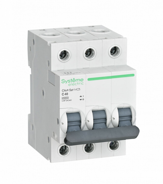 Автоматический выключатель серии City9 Set Systeme Electric, 3-полюсный, номинальный ток 40 А, характеристика С, Icn = 4.5 кА. Применяется в электрических сетях напряжением 400 В. Предназначен для защиты от перегрузок и токов короткого замыкания. Оснащен механизмом «мгновенной коммутации». Ударопрочный корпус из специального пластика с 6 металлическими заклепками. Безопасные клеммы исключают попадание кабелей в заклеммное пространство (ранее Schneider Electric EZ9F34340).