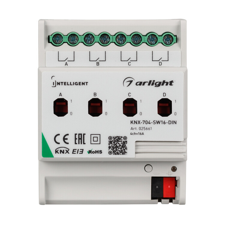 Релейный модуль 4-х канальный для KNX систем. Установка на DIN рейку. Возможность ручного управления. Напряжение питания DC 21-30V от шины данных. Максимальный коммутируемый ток - 16А/канал. Для коммутации электирических нагрузок в сетях с номинальным напряжением до 230В
