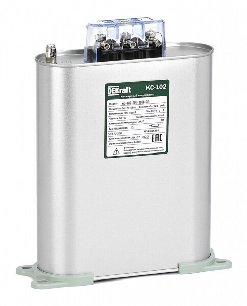 Косинусный трехфазый конденсатор самовосстанавливающегося типа серий КС-102 предназначен дл я корректировки коэффициента мощности в электрических сетях переменного тока 50/60 Гц напряжением 525 В. Номинальная мощность 20 кВАр.