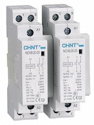 Контакторы модульные серии NCH8 Предназначены для управления нагрузками сетях переменного тока частотой 50/60 Гц напряжением до 400 В с номинальным током до 63 А. Они применяются в качестве устройства для дистанционно управления нагрузками, эксплуатирующимися в категориях применения AC-7b и AC-7a (неиндуктивная нагрузка или нагрузка с малой индуктивностью / резистивные электропечи, бытовые приборы и аналогичные потребители). Контакторы не предназначены для отключения токов короткого замыкания, поэтому их следует использовать в комплекте с соответствующим аппаратом защиты. Основные характеристики: Серия аппаратов: NСH8 Номинальный ток: 20 А Количество главных контактов: 2НО Номинальное рабочее напряжение: до АС250В Номинальное напряжение цепи управления: AC220/230В 50Гц Напряжение срабатывания: 85-110% Напряжение несрабатывания: 20-75% Категория применения: AC-1; AC-7a; AC-7b Категория размещения: II Степень загрязнения: 2 Степень защиты: IP20 Габаритные размеры (ШхВхГ): 18х85х65,6 мм Монтаж: на симметричную DIN-рейку 35 мм