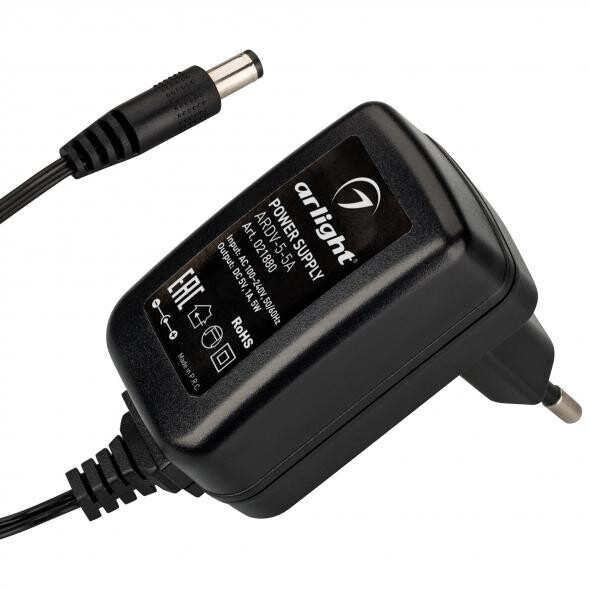 Сетевой адаптер с гальванической развязкой для светодиодных изделий 5 В (черный корпус). Мощность 5 Вт. Вход:100-240VAC, Выход: DC5V 1A, длина кабеля 1,5 м, коннектор 5.5x2.1x10мм. Размер 58x36x27 мм (размер без вилки). Гарантия 2 года.