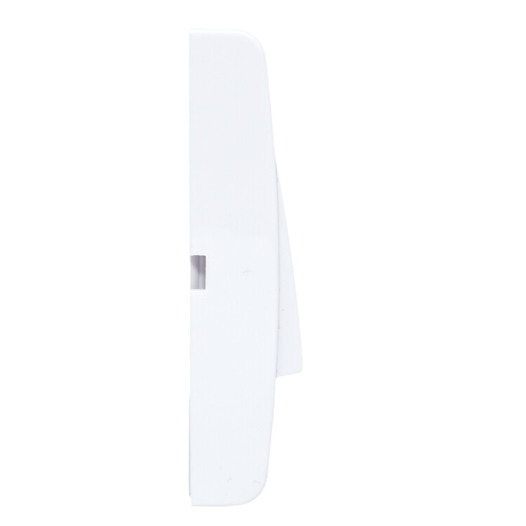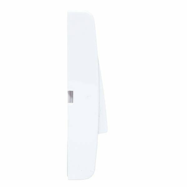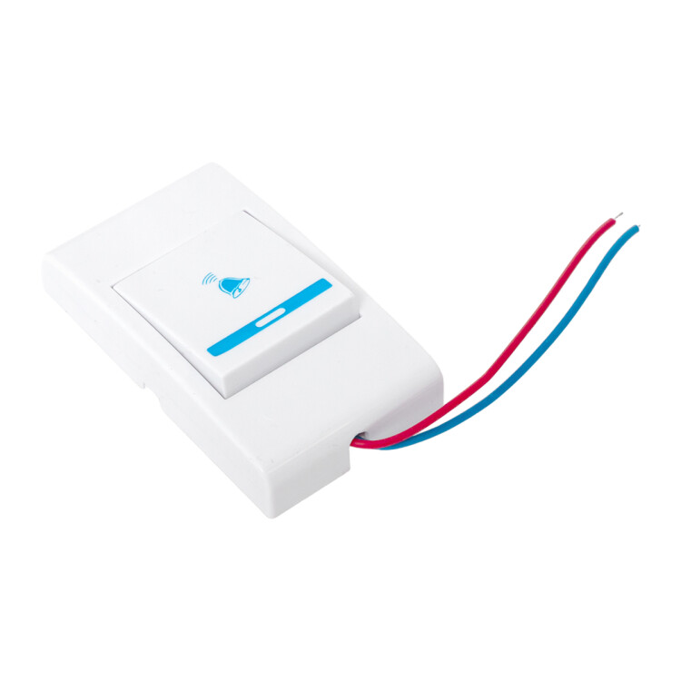 Кнопка предназначена для накладного монтажа. Изготовлена из прочного белого пластика с гладкой поверхностью. Дизайн кнопки простой и минималистичный, что позволяет ей гармонично вписываться в различные стили фасадов и дверей. Кнопка выступает над основанием, что обеспечивает легкость нажатия. Основание кнопки крепится к стене или дверной раме, и включает в себя необходимые провода для подключения к внутренней системе звонка. В дизайне преобладают чистые линии и минимализм, делая её универсальным выбором для многих домов.
