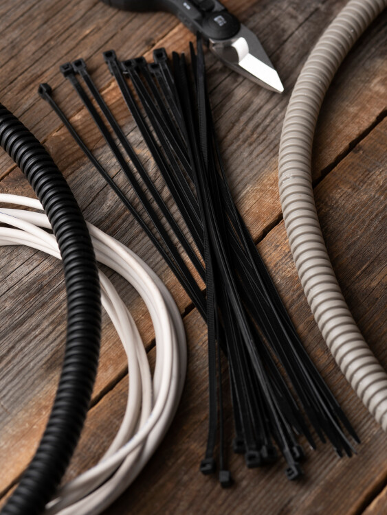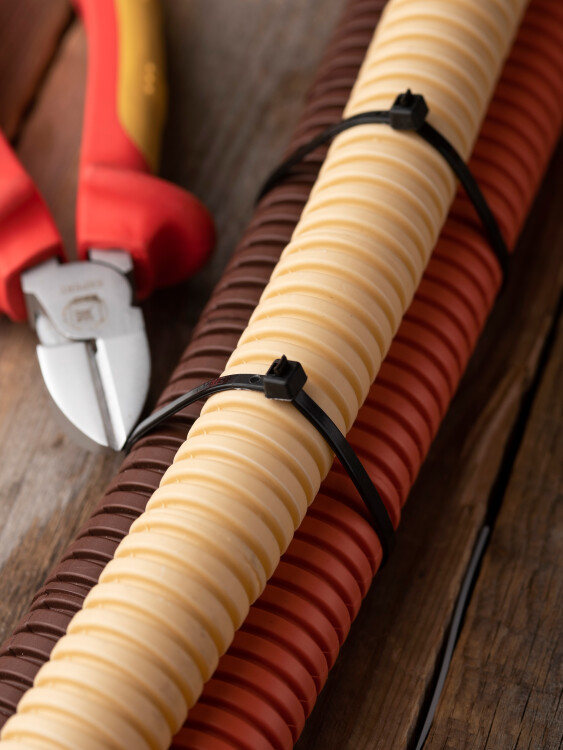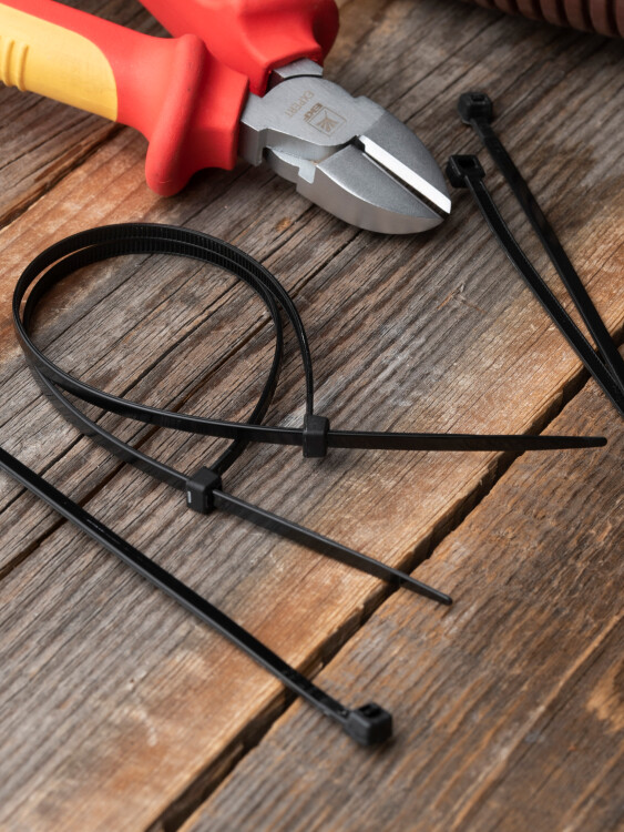 Предназначен для увязки кабелей и проводов в пучок и монтажа кабельных линий и проводников. Ремешок самофиксирующийся, блокирующий механизм. Изготовлен из Nylon 6.6, устойчивого к старению, коррозии, воздействию солей, ультрафиолета, кислот, щелочей, спирта, бензина и масел. При производстве кабельных стяжек черного цвета добавляется угольный порошок, который является одним из наиболее эффективных стабилизаторов. Он улучшает физические свойства продукции в стойкости к погодным условиям и УФ-излучению (прямые солнечные лучи).