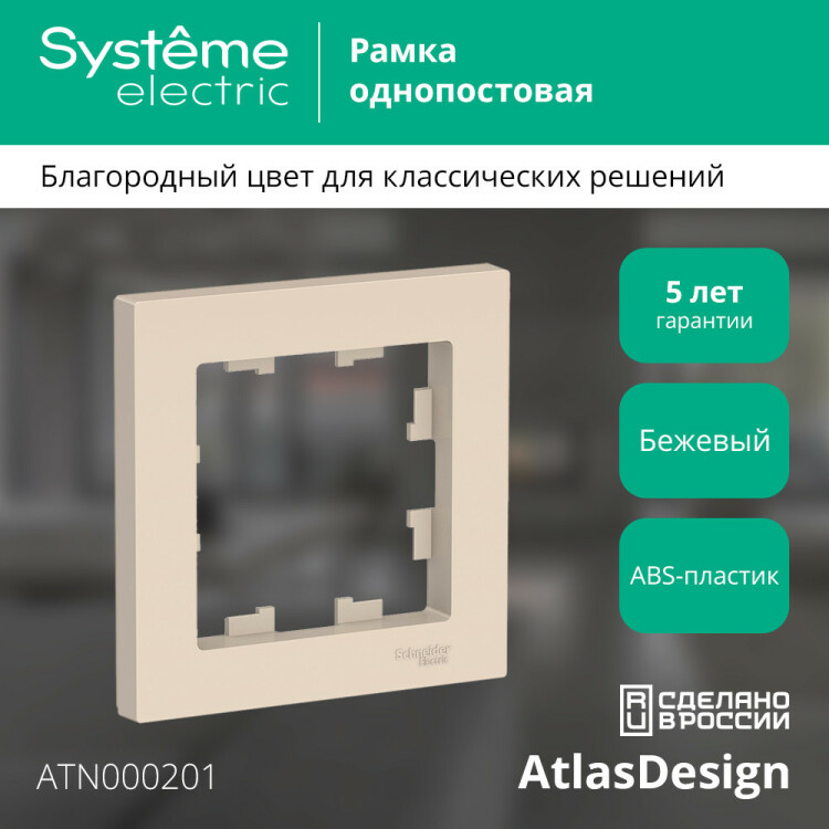 Рамка Systeme Electric (ранее Schneider Electric) серии AtlasDesign в бежевом цвете одинарная. Лицевые детали из качественного ABS-пластика, устойчивого к царапинам и УФ-излучению. Позволяет гармонично вписать электроустановочное изделие в интерьер помещения.