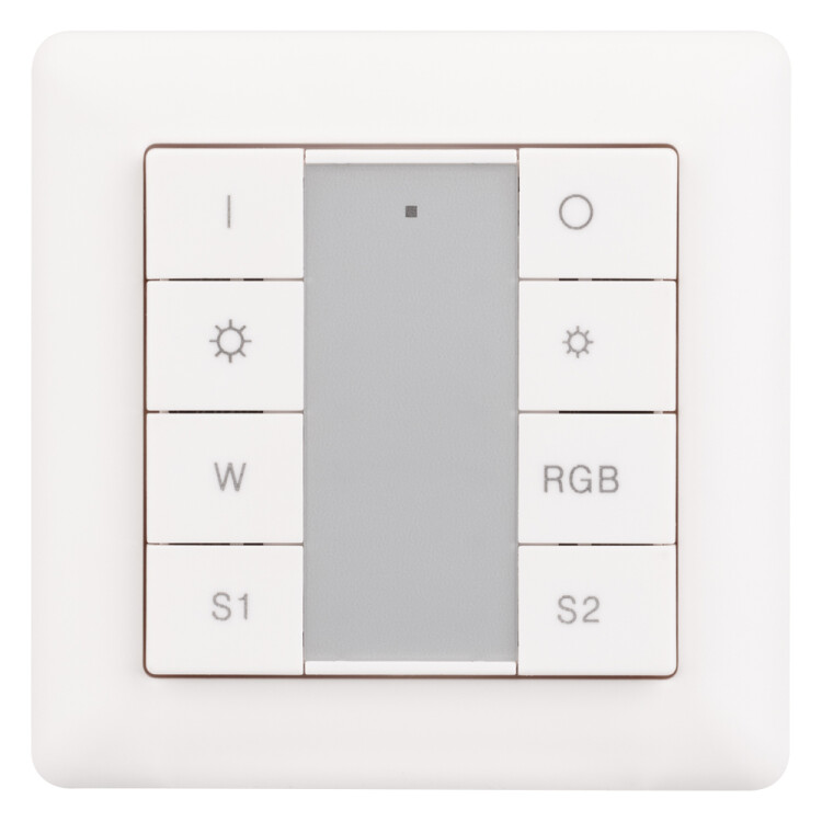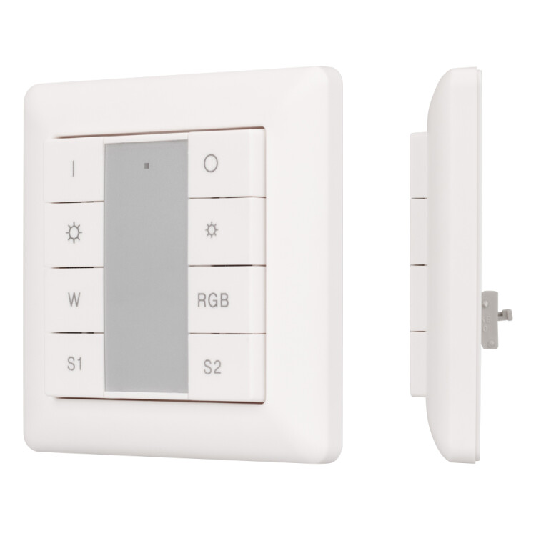 Встраиваемая кнопочная белая пластиковая панель для работы по протоколу DALI. Включение/выключение, диммирование и управления цветом свечения (8 кнопок управления) для мультицветных светодиодных RGBW-лент. 1 зона управления, возможно широковещательное управление. Вызов и сохранение 2-х сцен. Питание по шине DALI. Полнофункциональная работа по DALI DT8: до 64 устройств на шине, при адресации 4 каналов (RGBW) на 1 адрес. Стандартная рамка входит в комплект поставки.