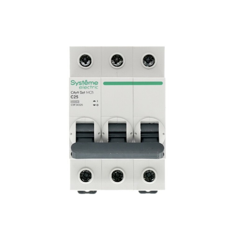 Автоматический выключатель серии City9 Set Systeme Electric, 3-полюсный, номинальный ток 25 А, характеристика С, Icn = 4.5 кА. Применяется в электрических сетях напряжением 400 В. Предназначен для защиты от перегрузок и токов короткого замыкания. Оснащен механизмом «мгновенной коммутации». Ударопрочный корпус из специального пластика с 6 металлическими заклепками. Безопасные клеммы исключают попадание кабелей в заклеммное пространство (ранее Schneider Electric Easy9 EZ9F34325).
