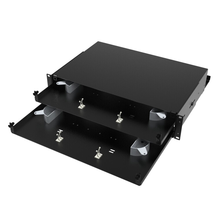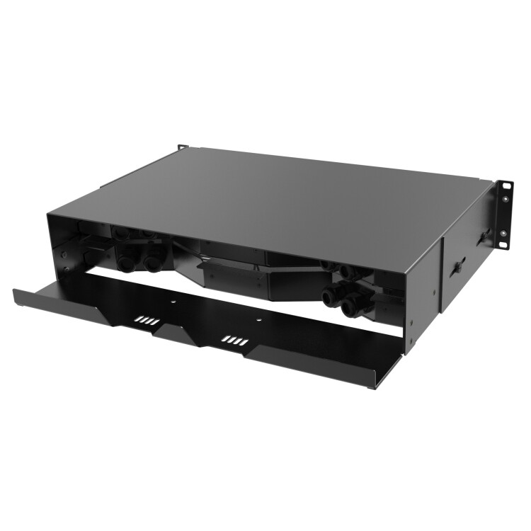 Оптический бокс представляет собой 19” конструктив с выдвижной панелью, на которой располагются сплайс-кассеты (от 1 до 4, в зависимости от типа сплайс-кассеты, приобретаются дополнительно) и уложены соединительные трубки сваренных оптических волокон. С обратной стороны оптического кросса организованы 4 ввода кабеля. Крепежные уголки 19” конструктива позволяют регул ировать глубину посадки оптической полки в коммутационном шкафу. Высота оптического бокса - 2U.