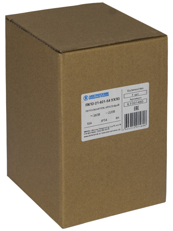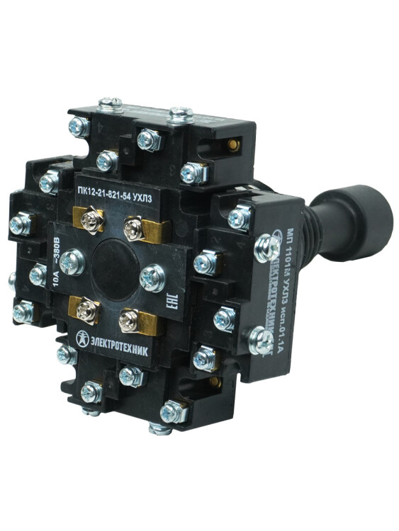 Электротехник ПК12-21-821-54 УХЛ3, 380В/50Гц, 10А, без защиты от попадания стружки, рукоятка - 8 полюсов с одним фиксирующим положением, толкатель - 2 полюса, IP54, переключатель крестовой (ЭТ)