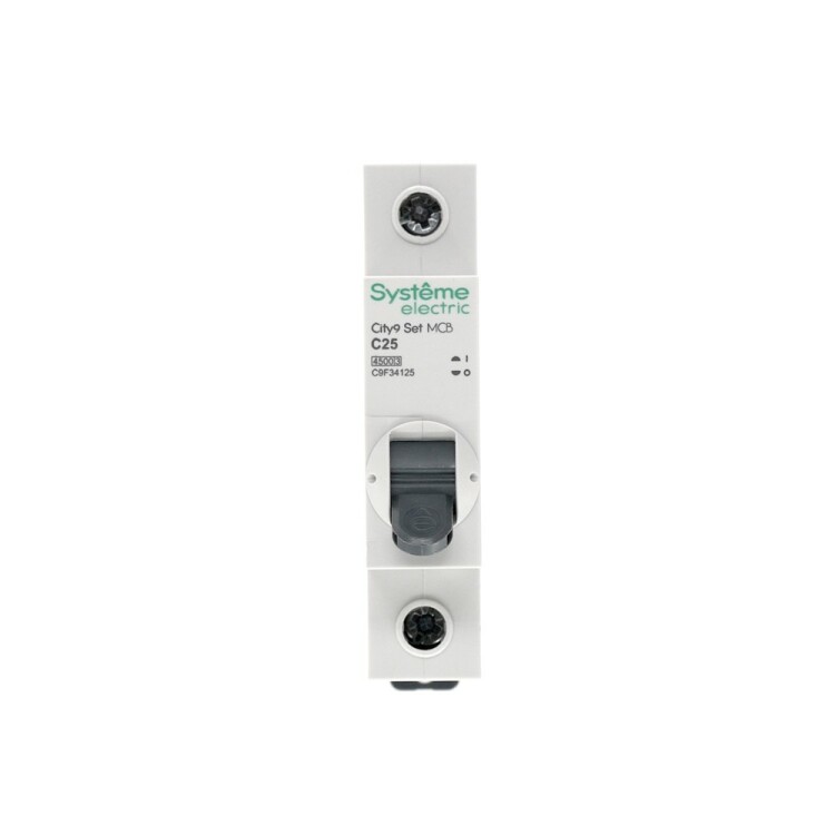 Автоматический выключатель серии City9 Set Systeme Electric, 1-полюсный, номинальный ток 25 А, характеристика С, Icn = 4.5 кА. Применяется в электрических сетях напряжением 230 В. Предназначен для защиты от перегрузок и токов короткого замыкания. Оснащен механизмом «мгновенной коммутации». Ударопрочный корпус из специального пластика с 6 металлическими заклепками. Безопасные клеммы исключают попадание кабелей в заклеммное пространство (ранее Schneider Electric Easy9 EZ9F34125).