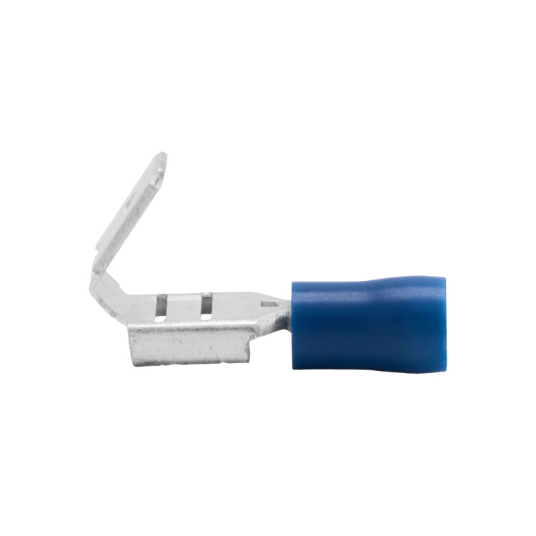 Изолированные плоские наконечники быстрого соединения предназначены для оконцевания кабеля и про водов с медными жилами сечением от 1.5 до 2,5 мм² в электрических цепях переменного и постоянного тока, напряжение до 600 В. Материал контактной части – электротехническая медь, материал изоляции - ПВХ. Луженое покрытие обеспечивает защиту от коррозии. Фланец изолирован. Номинальный размер соединителя 6,3×0,8 мм². Цвет - синий.