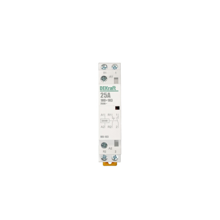 Модульный контактор серии МК-103 Dekraft; н ом.ток 25 А (АС-7а); кол-во и исполнение контактов – 1НО+1НЗ; напряжение управления 220 В пер.тока; ширина – 1 мод. х 18 мм; установка – на DIN-рейку. Контакторы МК-103 применяются в сетях напряжением до 400 В пер.тока для дистанционного управления небольшими нагрузками, требующими большого количества включений / отключений, например, насосы, системы вентиляции и т.п. Модульные контакторы не требуют дополнительных настроек и специального обслуживания.