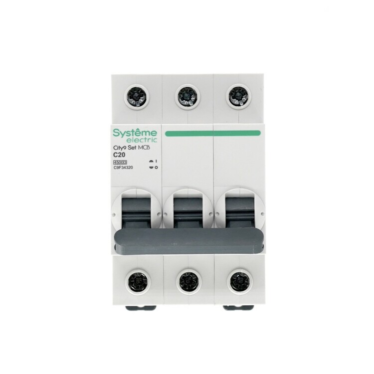 Автоматический выключатель серии City9 Set Systeme Electric, 3-полюсный, номинальный ток 20 А, характеристика С, Icn = 4.5 кА. Применяется в электрических сетях напряжением 400 В. Предназначен для защиты от перегрузок и токов короткого замыкания. Оснащен механизмом «мгновенной коммутации». Ударопрочный корпус из специального пластика с 6 металлическими заклепками. Безопасные клеммы исключают попадание кабелей в заклеммное пространство (ранее Schneider Electric Easy9 EZ9F34320).