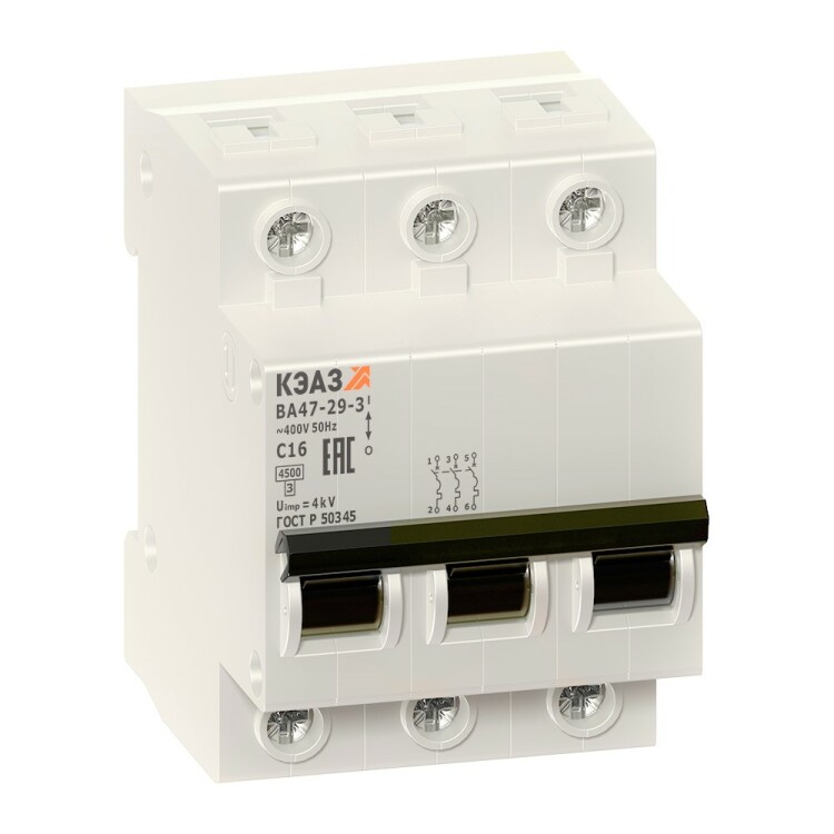 Модульный автоматический 3 полюсный выключатель переменного тока с предельной коммутационной способностью при переменном токе 4.5 кА на номинальный ток 25 А .
