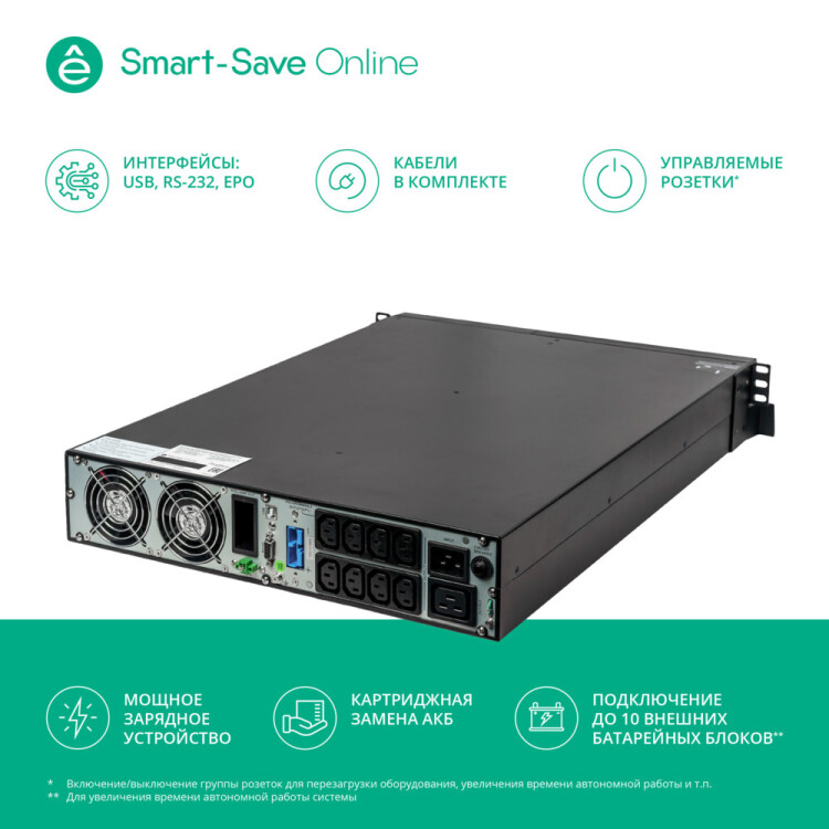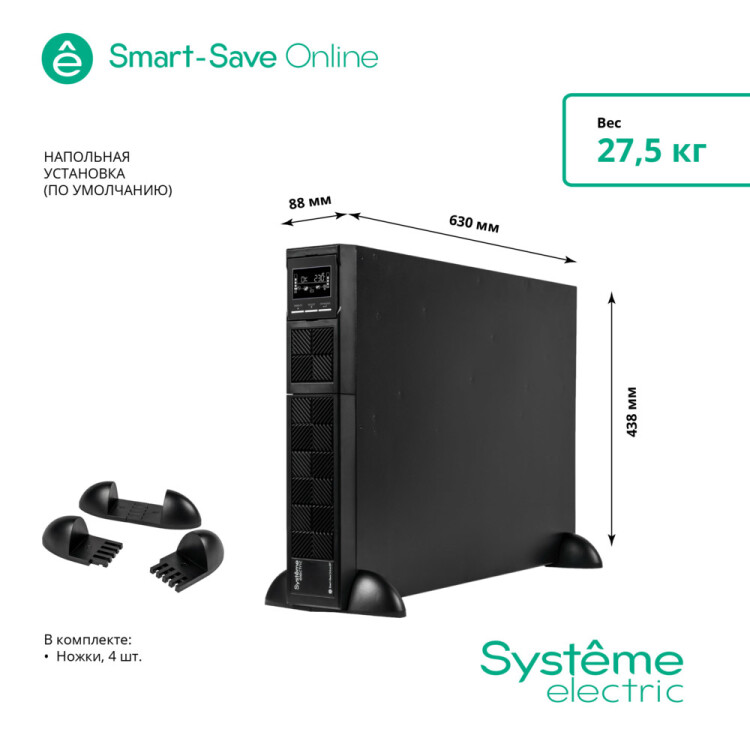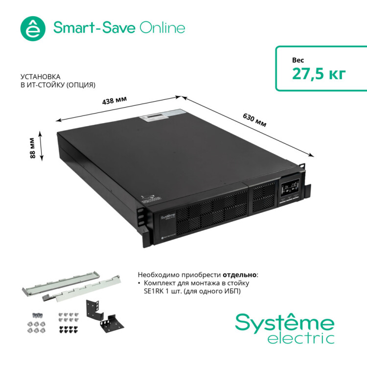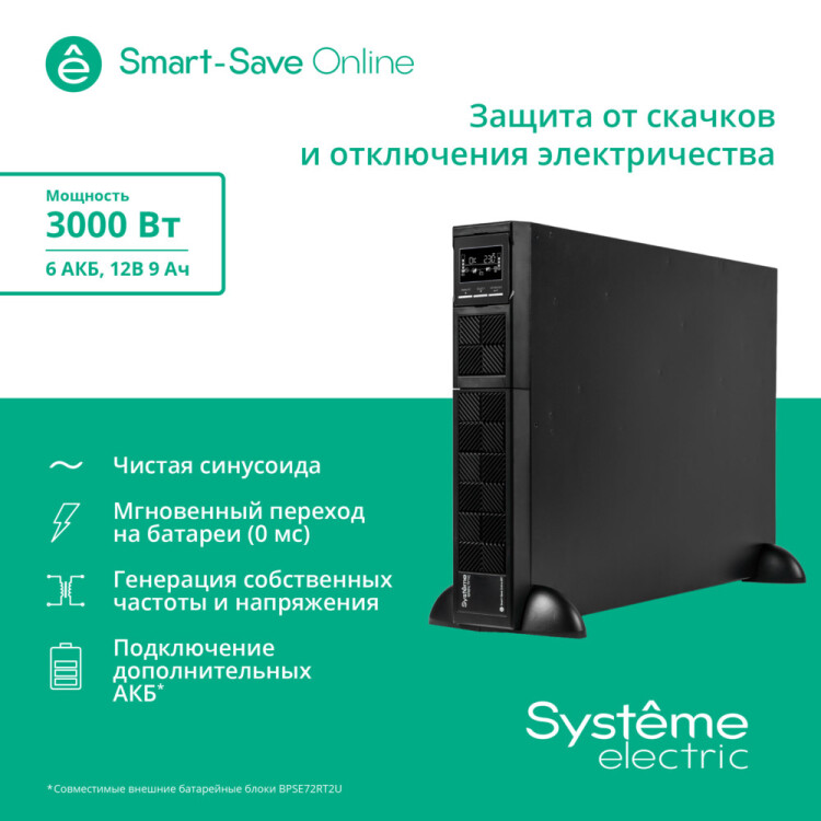 ИБП Smart – Save Online SRTSE3000RTXLI 3кВА/3кВт двойного преобразования для защиты чувствительного оборудования в малых и средних предприятиях. Имеет высокий коэффициент мощности PF=1.0. Предназначен для напольной установки или для установки в серверные стойки. Наиболее продвинутый LCD-дисплей, содержащий 20 настроек. Функция USB HID позволяет видеть базовую информацию о заряде ИБП на ПК без установки и/или входа в ПО. Наличие разъёма EPO для системы аварийного отключения. Большое количество выходных розеток – 8 IEC C13 + 1 IEC C19, есть группа программируемых розеток. Компактный корпус – 2U. Возможность подключения до 10 дополнительных внешних батарейных блоков (ранее Schneider Electric SRT3000RMXLI). 2 года с момента продажи, но не более 27 месяцев с даты производства