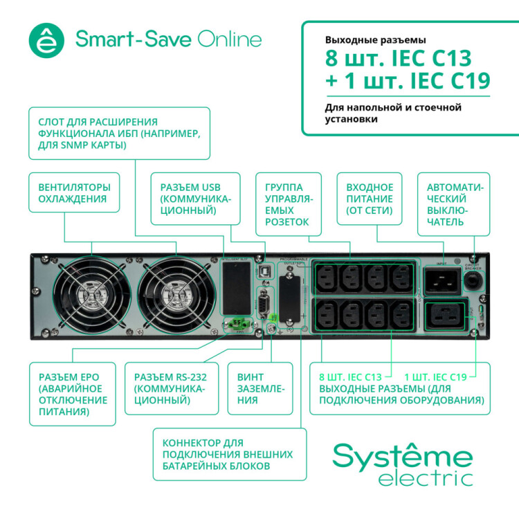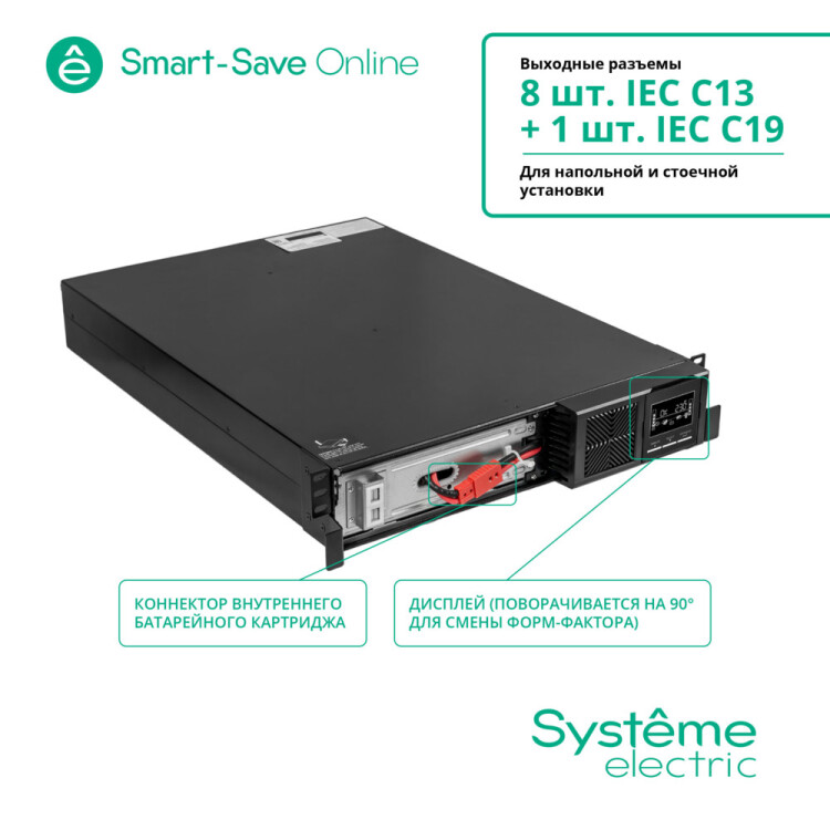 Systeme Electric ИБП Smart-Save Online SRT Systeme Electric 3КВА,XL,RT 2U,230В,8 C13+1 С19,SmSlot