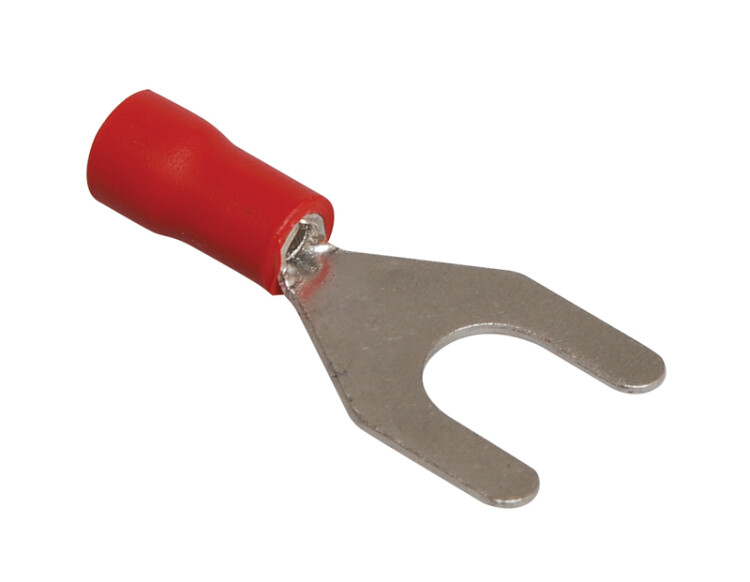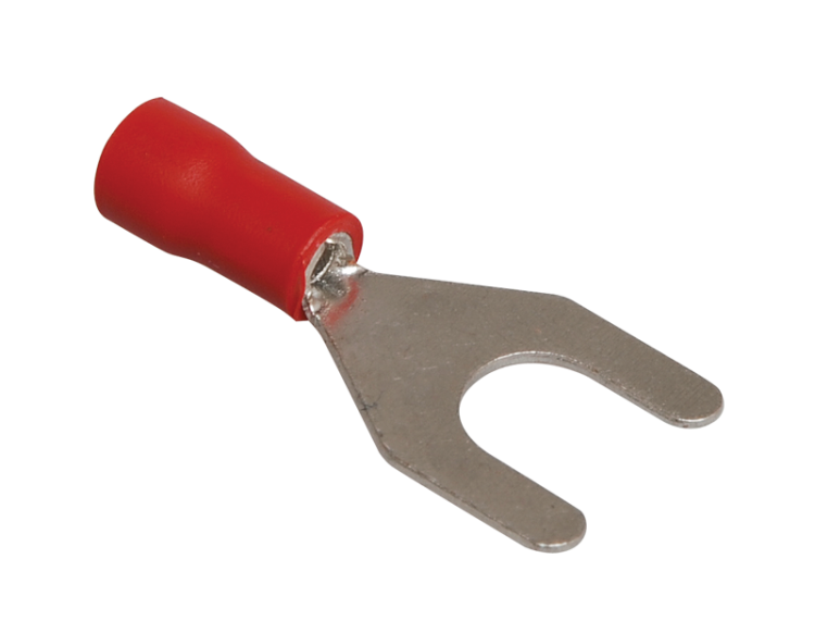 Наконечни к вилочный предназначен для оконцевания опрессовкой проводов с медными жилами и используется при монтаже электрических узлов, где предусмотрено соответствующее контактное соединение на основе винтовой фиксации. Провести полный демонтаж крепежного соединения возможно, лишь ослабив винтовую фиксацию.