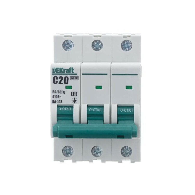 Автоматический выключатель серии ВА-103 NEW DEKraft; 3P; номинальный ток 20 А; характеристика C; отключающая способность 6 кА, что позволяет использовать аппараты в качестве вводных. 5 монолитных заклепок повышают прочность корпуса аппарата. Окошко-индикатор всегда показывает состояние контактов вне зависимости от положения рукоятки управления. Боковые каналы охлаждения повышают стабильность работы при высоких температурах окружающей среды. Есть возможность установки дополнительных аксессуаров с левой стороны устройства. Аппарат на 100% совместим с корпусами и оболочками DEKraft, Systeme Electric.