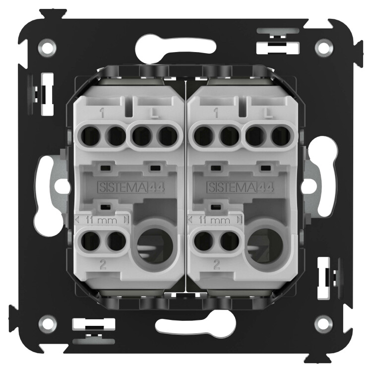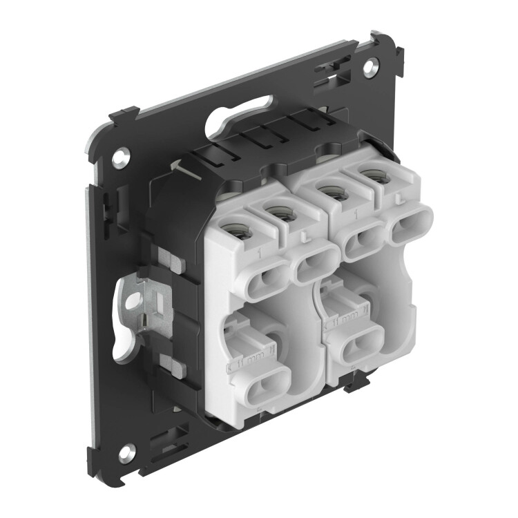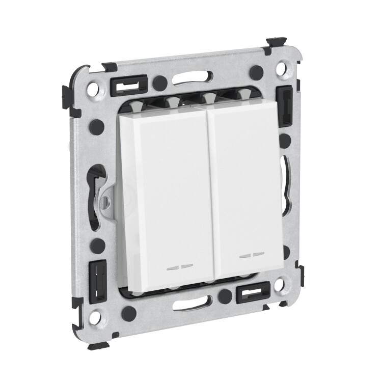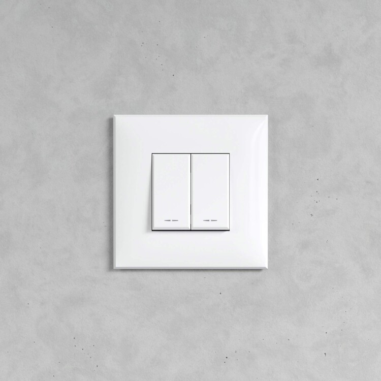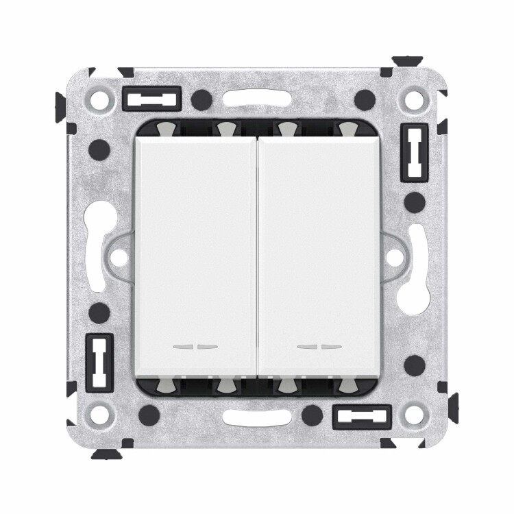 Задача двухклавишного переключателя – управление двумя контурами освещения из двух точек. Он позволяет включить/выключить освещение двумя светильниками из удобной точки – например, в спальне переключатель может размещаться возле кровати. Переключатель предназначен для скрытого монтажа в стену. Номинальное напряжение – 230 В, номинальный ток – 16 А.