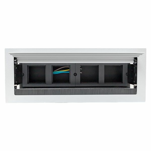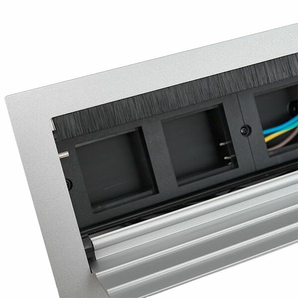 Встраиваемый настольный лючок, 8 модей, C-Line. Настольный лючок – изделие, включающее в себя верхнюю открывающуюся крышку и кронштейны для крепления приборных рамок и приборной коробки. Настольный лючок предназначен для размещения ЭУИ в столе. Монтаж производится в предварительно подготовленное отверстие 284х104 мм для 8 модулей. Сетевой кабель питания (2 метра), приборная коробка, приборные рамки и крепеж в комплекте.