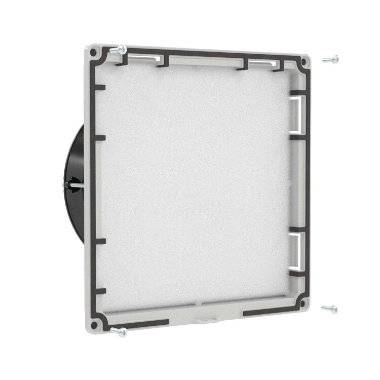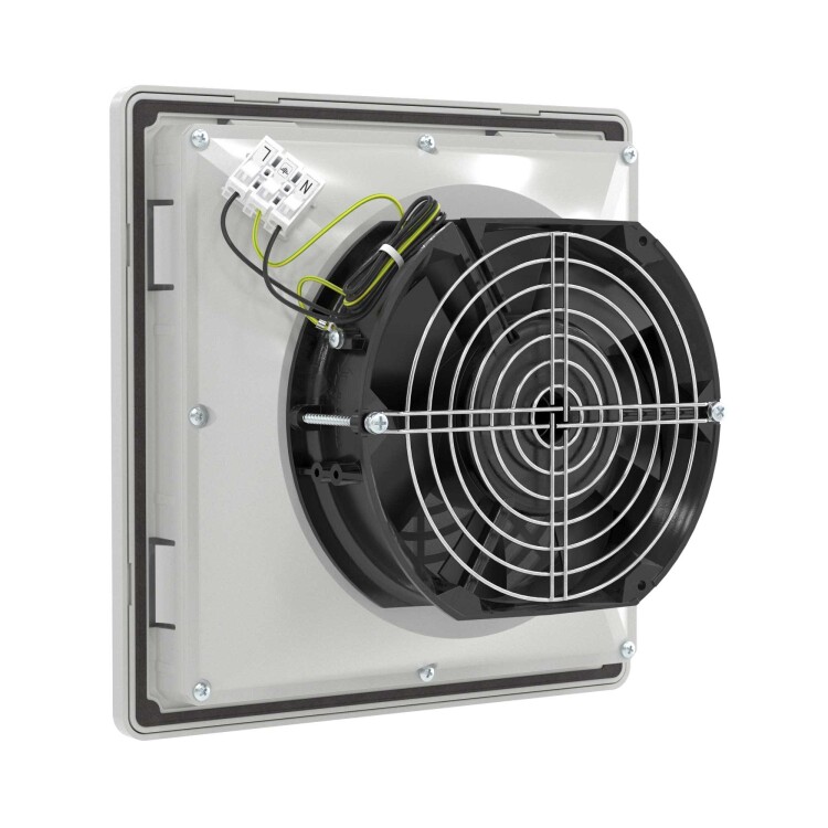 Вентиляторы RV изготовлены в России. Они обладают высоким качеством и надежностью, могут применяться даже в тяжелых условиях эксплуатации. Возможна работа на вдув или на выдув, благодаря простой смене направления вращения. Изготовлены из устойчивого к УФ и не поддерживающего горение АБС–пластика и поликарбоната. Допустима установка на улице без навеса. Степень защиты IP54, опционально повышение до IP56. Монтаж осуществляется без использования инструмента при помощи защелок (опционально можно зафиксировать винтами, например, при вибрационных нагрузках). В комплекте - воздушный фильтр с возможностью быстрой замены без инструмента. Внешние размеры 205х205 мм, размер монтажного выреза 177,5х177,5 мм. Номинальный воздушный поток при 50 Гц составляет 100 м3/ч. Цвет - светло-серый, RAL 7035.