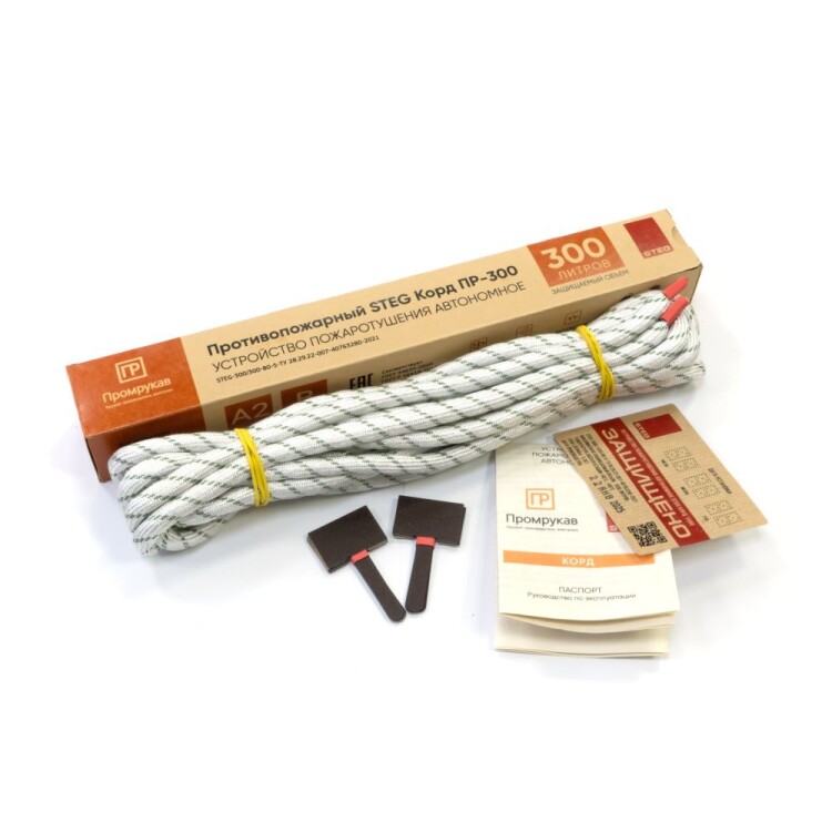 Устройство пожаротушения inSTEG Корд in Промрукав состоит из прочной термостойкой оплетки, наполненной термоактивируемым гранулированным огнетушащим составом комбинированного принципа действия. Гранулы включают в себя микрокапсулы с газовым огнетушащим веществом (ФК-5-1-12) и аэрозолеобразующий огнетушащий состав. Гибкость шнура позволяет распределить его в местах наиболее близких к очагу возможного возгорания (электротехнические шкафы, контактные группы, скопление проводов, электрооборудование и пр.), предотвращая возникновение и развитие пожара на ранней стадии в объемах до 1 500 литров. При воздействии пламени на Корд или достижении в точке нагрева температуры срабатывания (+160...270 °C), гранулы по всей протяженности корда термически разлагаются и импульсно выделяют комбинированные газо-аэрозольные огнетушащие вещества, которые сбивают пламя, резко снижают температуру, на химическом уровне разрушают цепи горения, создавая среду, не поддерживающую горение, и за несколько секунд полностью прекращающую пожар во всем крупногабаритном объеме.