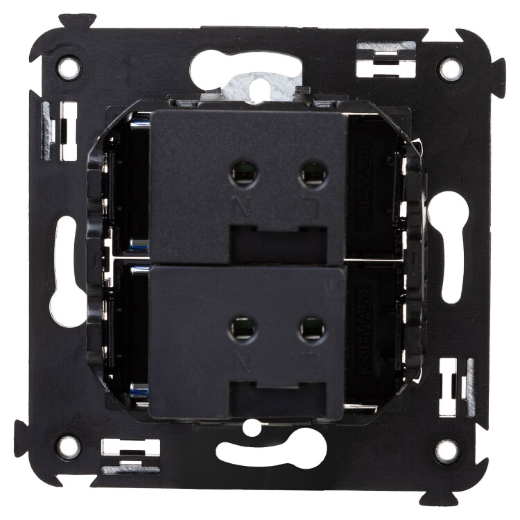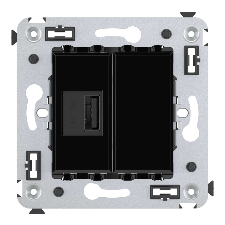USB зарядное устройство в стену. Назначение: для монтажа в подрозеточные коробки глубиной не менее 45 мм (код 59301); используется для подзарядки электронных гаджетов. Характеристики: винтовые зажимы; номинальное напряжение – 220 В; частота – 50–60 Гц; напряжение на выходе – 5 В; номинальный ток на каждом выходе - 2,1 А. Кол-во модулей: 2. Цвет: "Черный квадрат". Производитель оставляет за собой право вносить во внешний вид изделия изменения, которые не влияют на его функционал, безопасность и надежность.