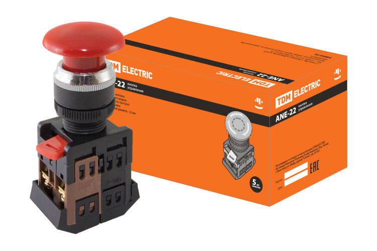 TDM Кнопка ANE-22 "Грибок"с фиксацией красный d22мм неон/230В 1з+1р